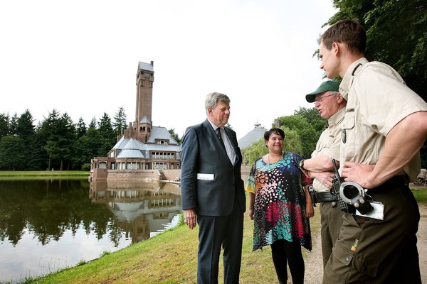 Foto van het werkbezoek van minister Opstelten van Veiligheid en Justitie en staatssecretaris Dijksma van Economische Zaken aan Nationaal Park de Hoge Veluwe. Tijdens het bezoek spraken de bewindspersonen met twee 'groene' boa's. Fotografie: Rob Acket